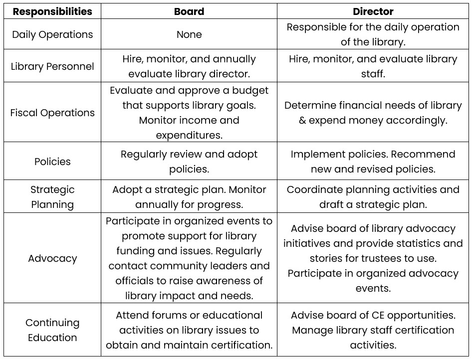 The library board provides oversight and governance of the library while the director manages day-to-day operations. Authority for management of the library will be from the board of trustees to the director who then delegates to other personnel. Among other duties, the director has responsibility for policy interpretation and issuance of procedural directives.